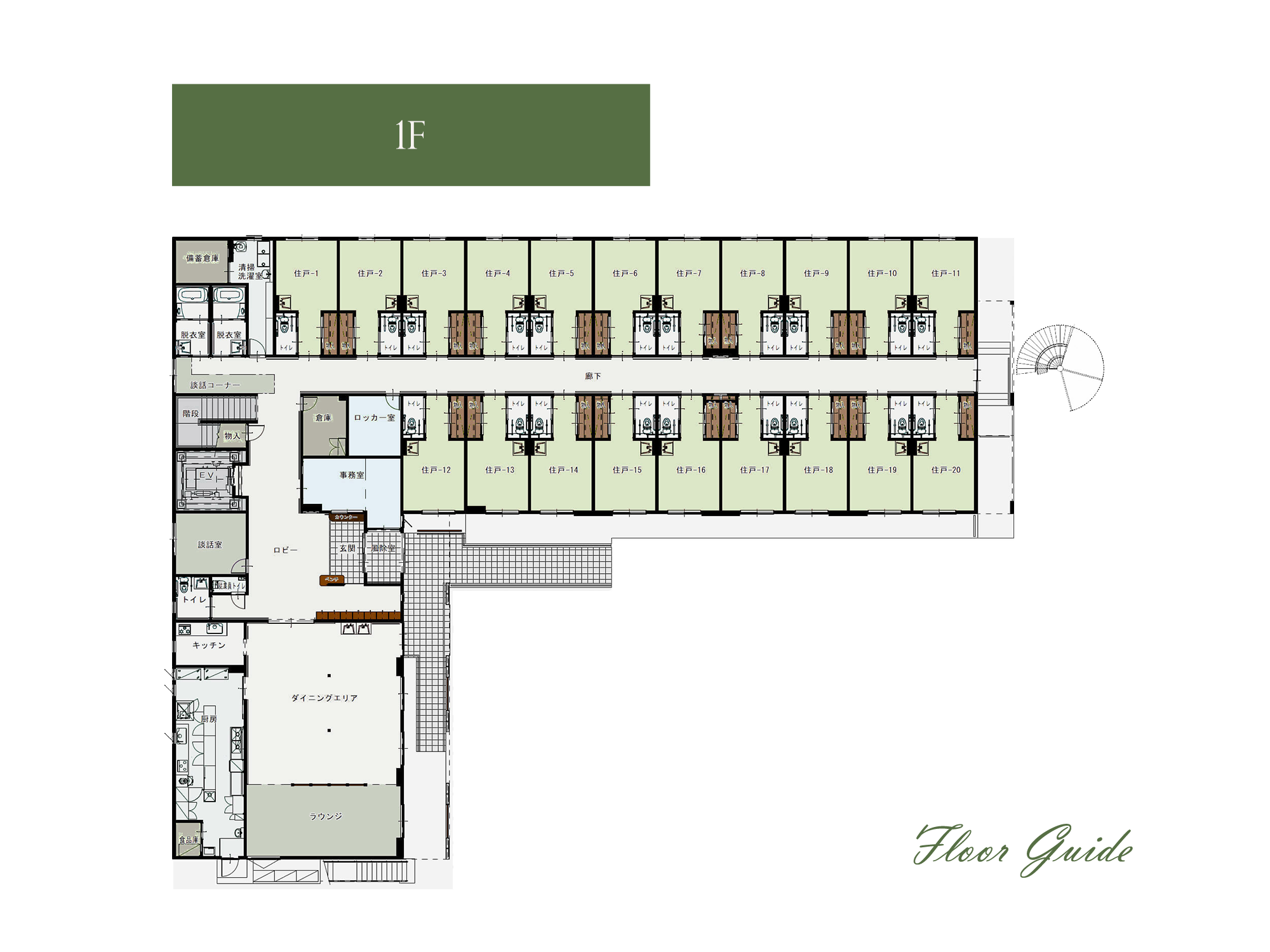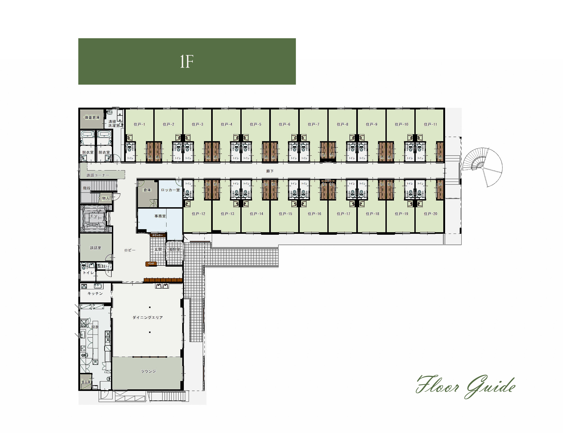 エントランスより右側が、居住スペース 左側が自由な共有 スペースとして、緑あふれる広々としたダイニングや寛げる特別ラウンジをご利用いただけます。